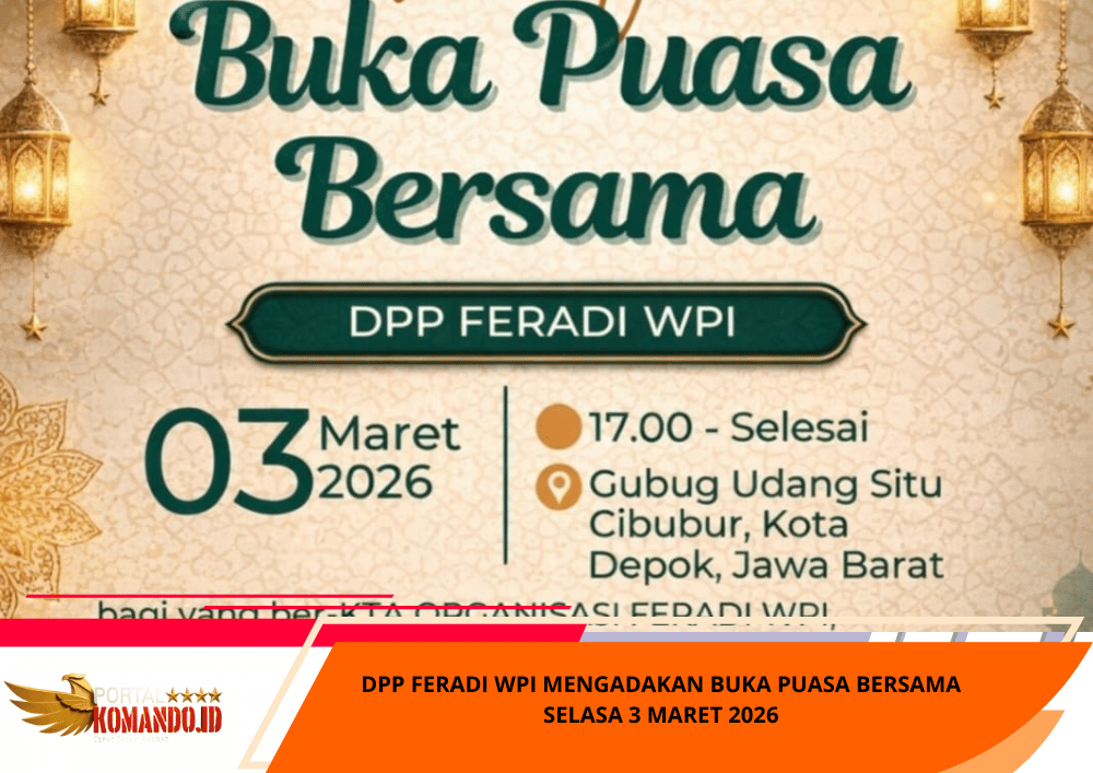 Portalkomando.id | Jakarta, Kamis 19 Feb 2026 — ditemui awak media, Ketua Panitia Acara Buka Bersama DPP FERADI WPI – Bendum IV DPP Muhammad Adji Setiadji, S.H., C.PFW., C.MDF., C.JKJ. beserta P.I.C. BUKBER DPP FERADI WPI Waketum Revan Pratama Wijaya, S.H., C.PFW., C.MDF., C.JKJ., Menyampaikan bahwa DPD FERADI WPI Jakarta akan mengadakan Agenda buka puasa bersama di Hari Selasa 3 Maret 2026. Mulai pk.17.00 – Selesai. Bertempat di Resto Gubug Udang Situ Cibubur, Jalan Alternatif Cibubur Nomor 4, Kota Depok, Jawa Barat. Semoga acara ini bisa mempererat tali persaudaraan antar sesama anggota dan pengurus FERADI WPI seluruh Indonesia.