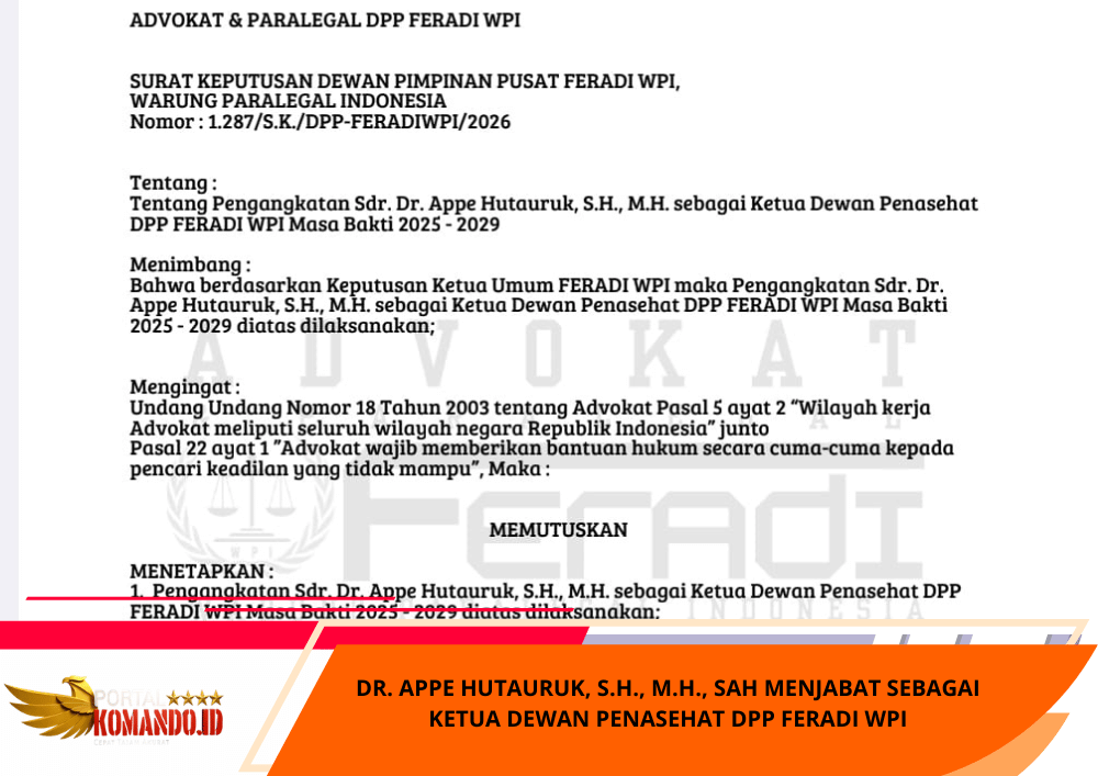 “Selasa lalu 17 Februari 2026 saya berkomunikasi dg Dr. Appe Hutauruk, S.H., M.H. berkaitan kesediaan beliau menjabat sebagai Ketua Dewan Penasehat Dewan Pimpinan Pusat FERADI WPI, dan Puji Tuhan beliau bersedia”. Dan telah terbit S.K. Penagangkatan Dr. Appe Hutauruk, S.H., M.H. sebagai Ketua Dewan Penasehat DPP FERADI WPI, S.K. terbit tanggal 18 Februari 2026. Sehingga Semenjak 18 Februari 2026 beliau secara resmi dan sah telah menjadi bagian pengurus DPP FERADI WPI.” Ujar Adv. Donny Ketum FERADI WPI.