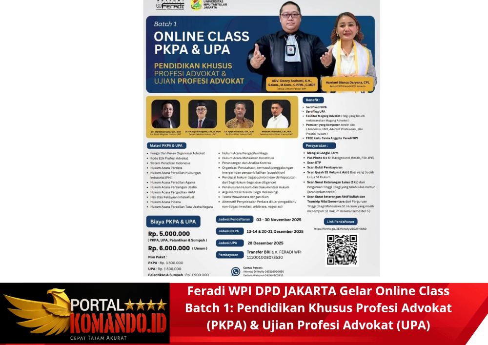 Dalam upaya memperkuat kapasitas hukum dan profesionalisme calon advokat, FERADI WPI bekerja sama dengan Universitas Mpu Tantular Jakarta membuka pendaftaran Batch 1 Online Class PKPA & UPA. Kegiatan ini merupakan Pendidikan Khusus Profesi Advokat dan Ujian Profesi Advokat yang akan digelar secara daring pada Desember 2025.