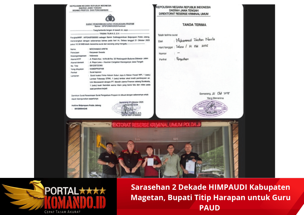Portalkomando.id | Semarang,Selasa, 21 Oktober 2025 — Hadir di Polda Jateng Bapak Ketua Umum Organisasi Advokat FERADI WPI sekaligus Pimpinan Firma Hukum Subur Jaya & Rekan Adv. Donny Andretti, S.H., S.Kom., M.Kom., C.Md., C.PFW., C.MDF. C.JKJ didampingi Bapak M Arifin SH MH, S.Sos., M.M., C.PFW., C.MDF. C.JKJ. Waketum DPP FERADI WPI sekaligus SekJend Ikatan Wartawan Jagat Raya Indonesia, Bapak David Yuwono SH MH LLM, S.E., M.B.A., C.PFW., C.MDF., C.JKJ. Bendahara DPP FERADI WPI, Kepala Divisi DPP FERADI WPI Bapak Eko Affandy SH, S.E., C.PFW., C.MDF., C.JKJ., kehadiran Tim Hukum ini sebagai tim Kuasa Hukum untuk mendampingi Korban Dugaan tindak pidana perampasan mobil di jalanan yaitu 1 unit mobil Pajero Putih Nomor Polisi AD 1346 QP atas nama di STNK Umi Munawaroh yang saat kejadian sedang dikendarai putranya yang bernama Muhammad Ziedan Navila di sekitar Surakarta Jawa Tengah.