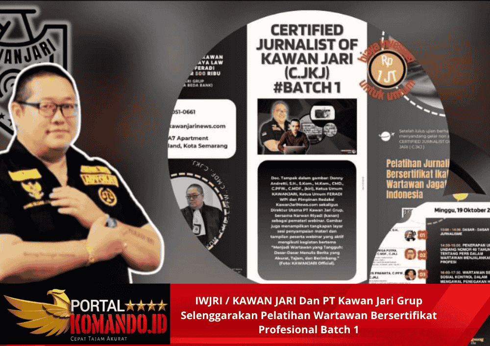 Portalkomando | Semarang, Minggu, 19 Oktober 2025 — Ikatan Wartawan Jagat Raya Indonesia (IWJRI / KAWAN JARI) bersama PT Kawan Jari Grup menggelar Pelatihan Wartawan Bersertifikat Profesional melalui program Certified Journalist of Kawan Jari (CJKJ) Batch 1, yang dilaksanakan secara daring melalui Google Meet. Kegiatan ini diikuti oleh peserta dari berbagai wilayah Indonesia dengan tujuan meningkatkan kompetensi, integritas, dan profesionalisme wartawan di era digital.