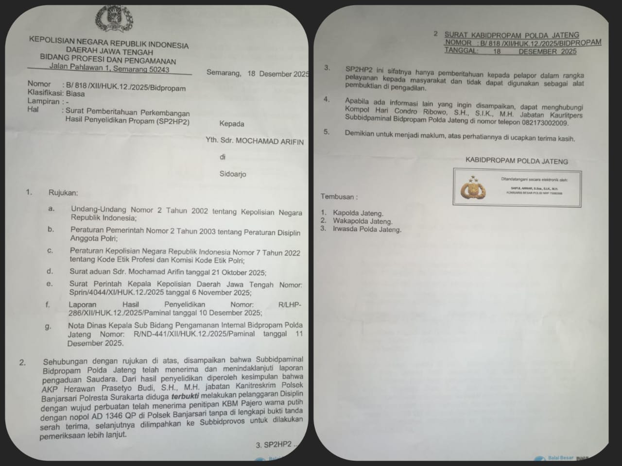 SP2HP2 Nomor B/818/XII/HUK.12./2025/Bidpropam tersebut ditujukan kepada kuasa hukum pelapor, Mochamad Arifin. Dalam hasil penyelidikan internal, Bidpropam menyatakan bahwa AKP Herawan Prasetyo Budi, S.H., M.H., Kanit Reskrim Polsek Banjarsari Polresta Surakarta, diduga terbukti bersalah berkaitan penitipan kendaraan Mitsubishi Pajero AD 1346 QP tanpa bukti tanda serah terima resmi. Perkara selanjutnya dilimpahkan ke Subbidprovos untuk pemeriksaan lanjutan.