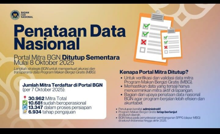“Portal mitra akan kami tutup sementara per 8 Oktober hingga waktu yang belum ditentukan. Langkah ini merupakan bagian dari proses verifikasi dan validasi data agar data yang tersaji benar-benar mencerminkan mitra aktif yang bekerja di lapangan,” ujar Kepala BGN,Prof. Dadan Hindayana,