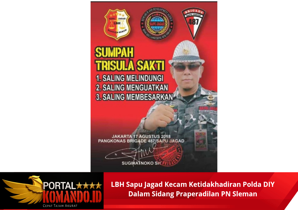 Portalkomando.id|SLEMAN,Selasa (4/11/ 2025) — Lembaga Bantuan Hukum (LBH) Sapu Jagad menyampaikan pernyataan sikap tegas terkait ketidakhadiran Polda Daerah Istimewa Yogyakarta (DIY) dalam sidang perdana praperadilan di Pengadilan Negeri Sleman, Selasa (4/11/2025). Sidang tersebut merupakan perkara antara RM Triyanto Prastowo sebagai pemohon melawan Polda DIY sebagai termohon.