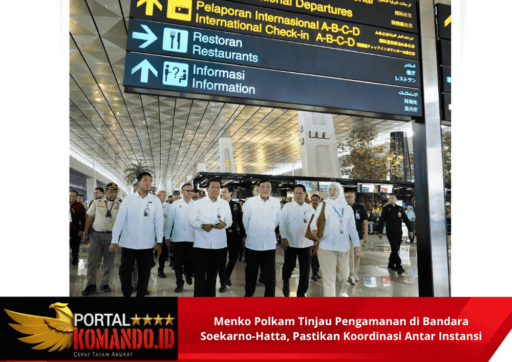 Portalkomando.id | Banten, Minggu 19 Oktober 2025 — Menko Polkam Jenderal TNI (purn.) Djamari Chaniago bersama Wamenko Polkam Letjen TNI (purn.) Lodewijk F. Paulus dan Sesmenko Polkam Letjen TNI Mochammad Hasan berserta jajaran melaksanakan peninjauan di Bandara Internasional Soekarno Hatta, Tanggerang, Banten, Minggu (19/10/2025).