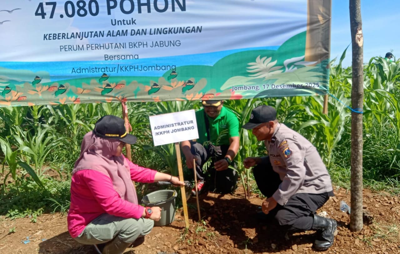 Portalkomando.id| JOMBANG, PERHUTANI (17/12/2025) — Perhutani Kesatuan Pemangkuan Hutan (KPH) Jombang Gandeng Muspika Wonosalam dan Pemerintah Desa Sumberejo penghijauan bersama tanam 47.080 pohon, dengan perincian Sengon 37.664 pelances dan Jabon 9.416 pelances.