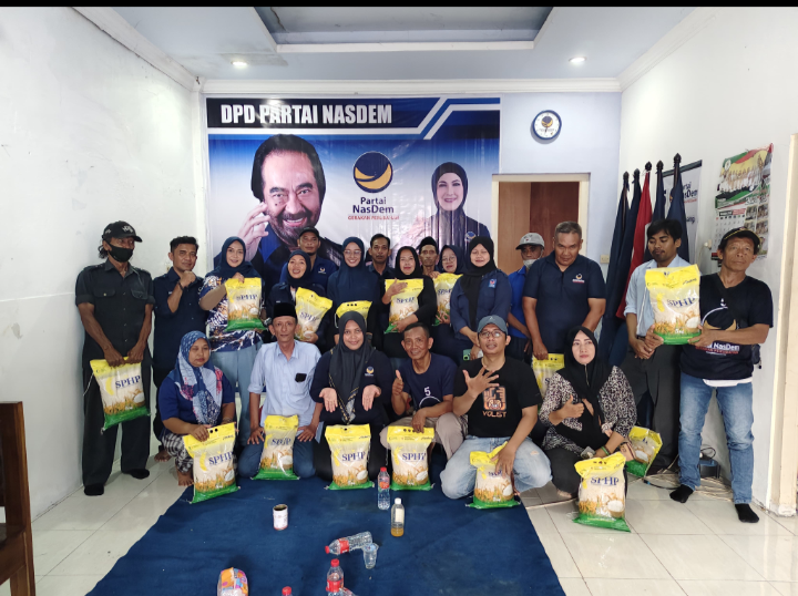Tidak berhenti sampai di situ, acara kemudian dilanjutkan dengan kegiatan “Berbagi Senyum, Berbagi Sembako”, yakni pembagian bantuan sembako kepada masyarakat sekitar kantor partai. Aksi sosial ini menjadi bentuk nyata kepedulian Partai NasDem terhadap warga yang membutuhkan, serta wujud kehadiran partai di tengah masyarakat.