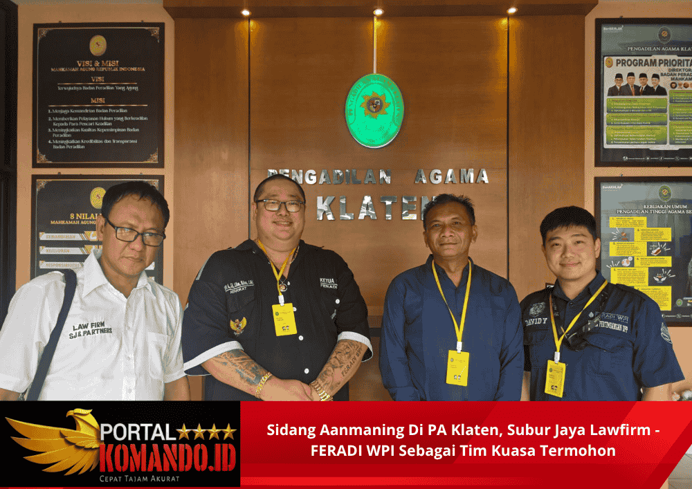 Portalkomando.id | Klaten,Selasa 20 Oktober 2025 — Advokat / Pengacara Kawakan Donny Andretti, S.H., S.Kom., M.Kom., C.Md., C.PFW., C.MDF., C.JKJ. didampingi David Yuwono SH MH LLM, S.E., M.M., M.B.A., C.PFW., C.MDF., C.JKJ Bendahara Umum III DPP FERADI WPI, Basriyanto, C.PFW., C.MDF., C.JKJ. Kepala Divisi DPP FERADI API dan M. Arifin SH MH S.Sos., M.M., C.MDF., C.PFW. C.JKJ. sebagai Kuasa Hukum Para Termohon Aanmaning menghadiri Sidang lanjutan Aanmaning di Pengadilan Agama Klaten dengan Nomor Perkara 0009/Pdt.Eks.HT/2025/PA.Klt.